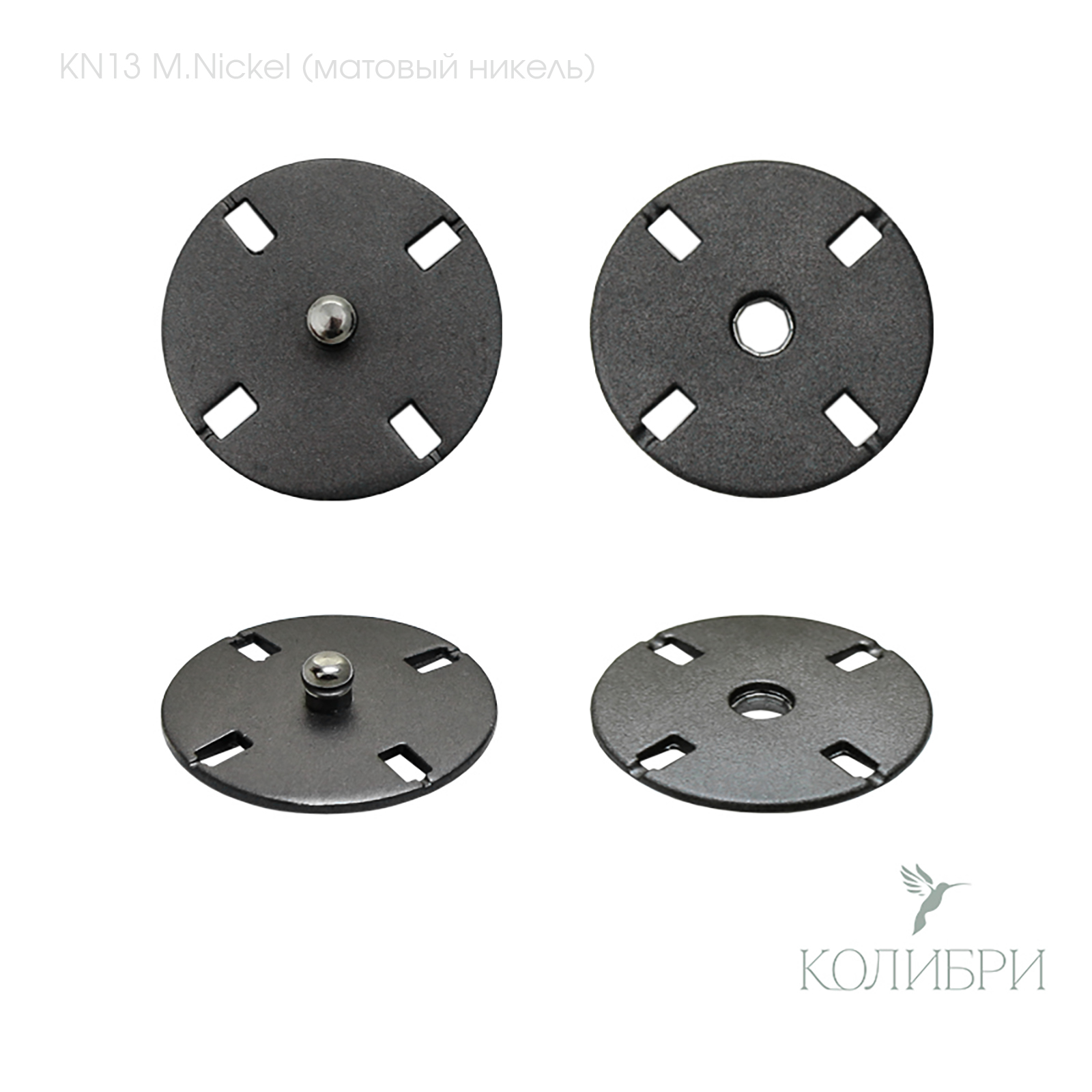 Пришивные кнопки KN13 - надежная металлическая фурнитура для соединения деталей одежды и аксессуаров. Представляют застежку, состоящую из двух металлических частей, входящих одна в другую.